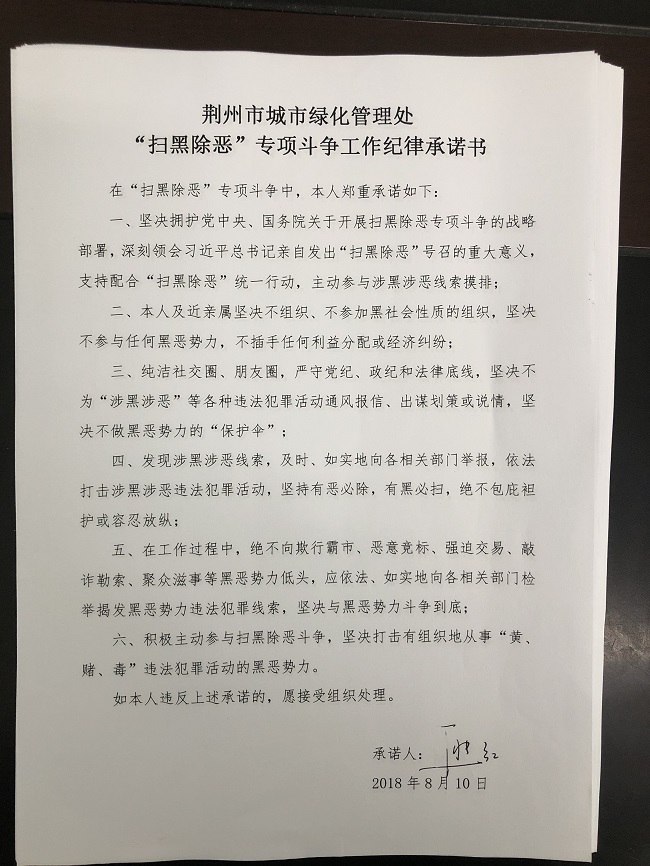 之后,黨員同志們圍繞“掃黑除惡、勇當先鋒”主題開展了討論,進一步統(tǒng)一了思想認識,紀律意識、規(guī)矩意識、責任意識得到強化,為堅決打贏掃黑除惡專項斗爭攻堅戰(zhàn)提供了思想和紀律保障。 最后,綠化處全體黨員同志簽訂了《“掃黑除惡”專項斗爭工作紀律承諾書》。《承諾書》從6個方面規(guī)定了掃黑除惡工作中需要遵守的紀律,要求全體干部職工自覺投身掃黑除惡專項斗爭,積極配合做好掃黑除惡專項斗爭,以身作則,帶頭遠離黑惡勢力,并對發(fā)現(xiàn)和掌握的涉黑涉惡違法犯罪及苗頭,及時向單位舉報。同志們紛紛表示,要切實履行承諾,筑牢防線、不踩紅線、守住底線,本著對組織、對家庭負責的態(tài)度,嚴格要求自己,勇于擔當、敢于碰硬,自覺同黑惡勢力做斗爭,發(fā)揮先鋒模范作用,推動綠化處“掃黑除惡、勇當先鋒”專項斗爭工作向縱深發(fā)展。
